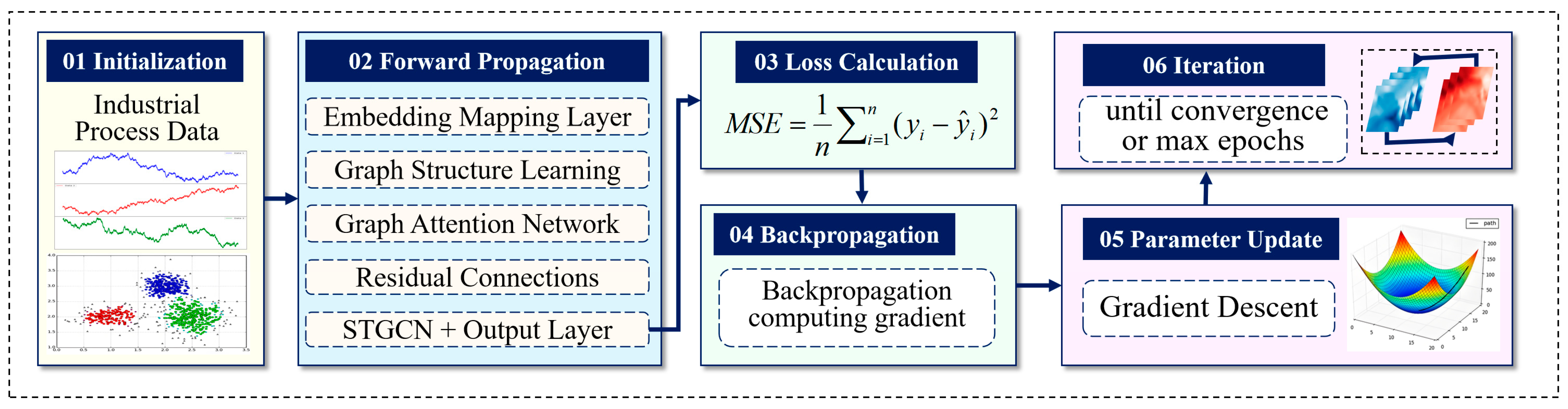 | Input: Process data , where . Quality variable data . Number of epochs , learning rate . Output: A trained VSL-STGCN model with optimized parameters . /* 1. Variable Selection (Offline) */ 1: Calculate feature importance for all variables in using SHAP algorithm. 2: Select top-k most important variables to form the input data . /* 2. Model Initialization */ 3: Initialize model parameters , including node embedding matrices , , and weights for GNN modules. /* 3. End-to-End Training */ 4: for epoch = 1 to do /* Forward Propagation */ 5: // Variable Graph Structure Learning 6: ← 7: ← 8: // Spatio-Temporal Feature Extraction 9: ← 10: ← 11: ← 12: ← /* Loss Calculation */ 13: Loss ← /* Backpropagation and Parameter Update */ 14: Compute gradients . 15: Update all trainable parameters (including , ) using gradient descent: 16: ← 17: end for 18: return Trained model with parameters . |