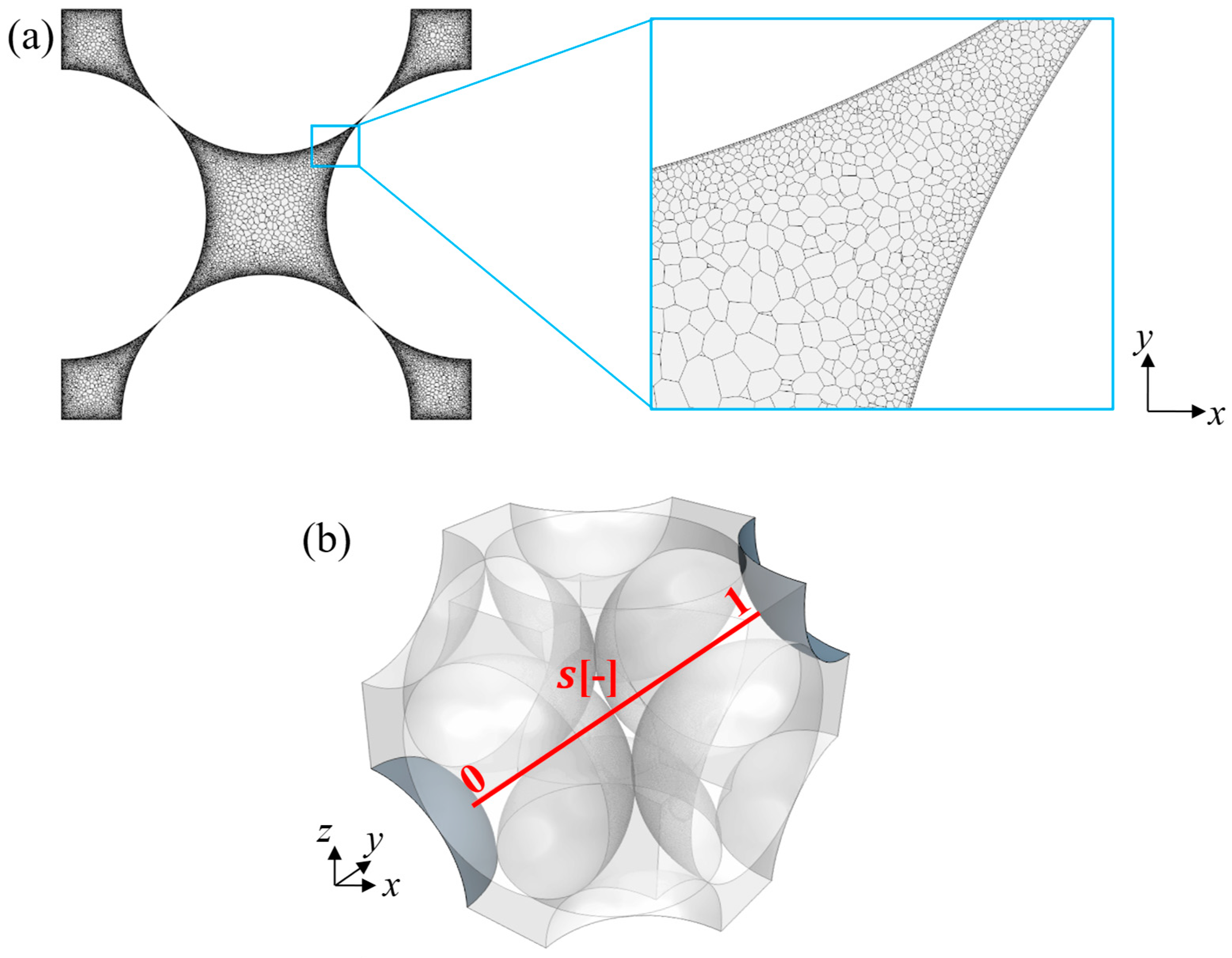 - He, X.; Apte, S.V.; Finn, J.R.; Wood, B.D. Characteristics of Turbulence in a Face-Centred Cubic Porous Unit Cell. J. Fluid Mech. 2019, 873, 608–645. [Google Scholar] [CrossRef]