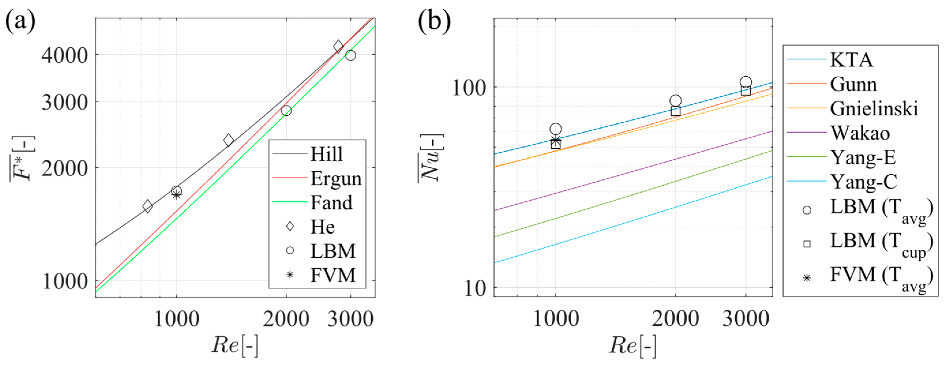 - Kravets, B.; Rosemann, T.; Reinecke, S.R.; Kruggel-Emden, H. A New Drag Force and Heat Transfer Correlation Derived from Direct Numerical LBM-Simulations of Flown through Particle Packings. Powder Technol. 2019, 345, 438–456. [Google Scholar] [CrossRef]