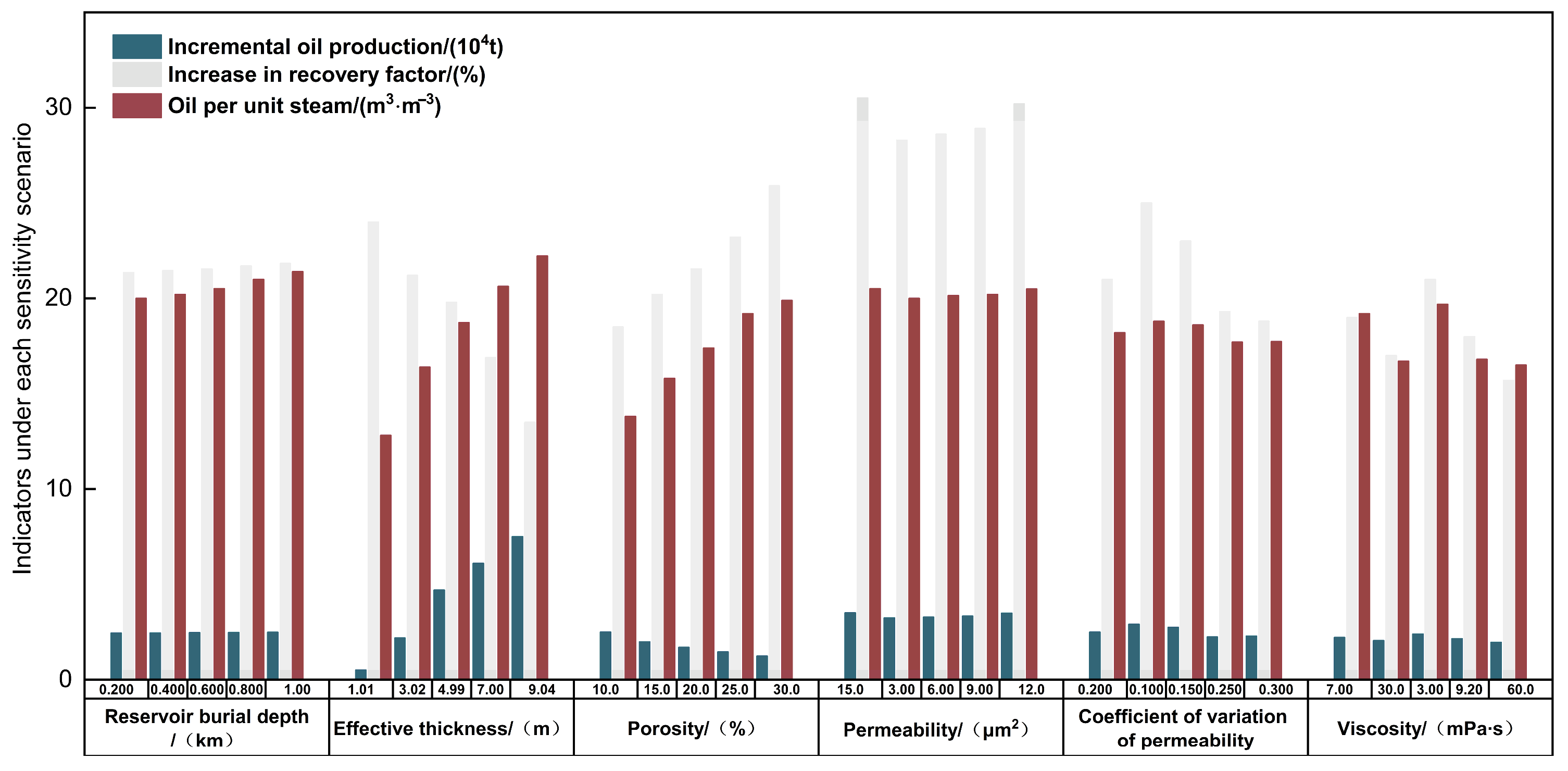 | Injection Temperature/°C | Liquid Production Rate/t·d−1 | Injection Dryness | Injection Rate/(m3·d−1) | Injection Time/d | Shut-In Time/d | Production Time/d | Gas-Oil Ratio Timing | Incremental Oil/t | ENPV/104 CNY |