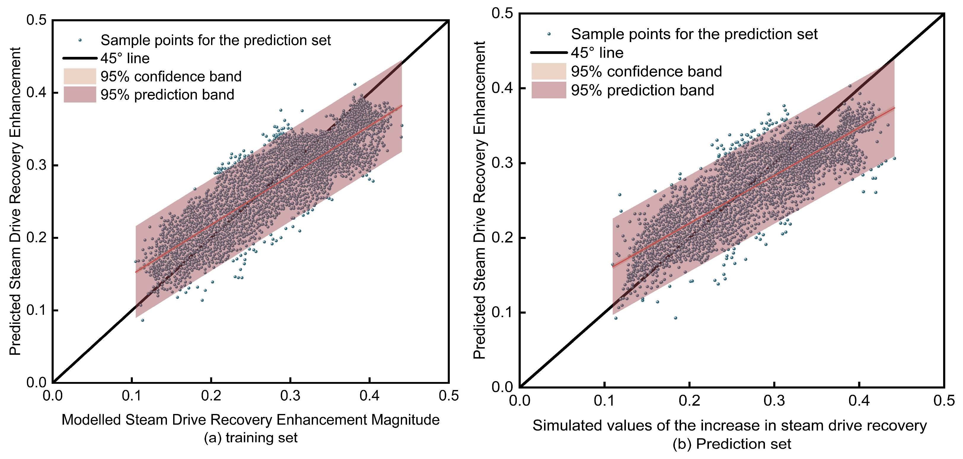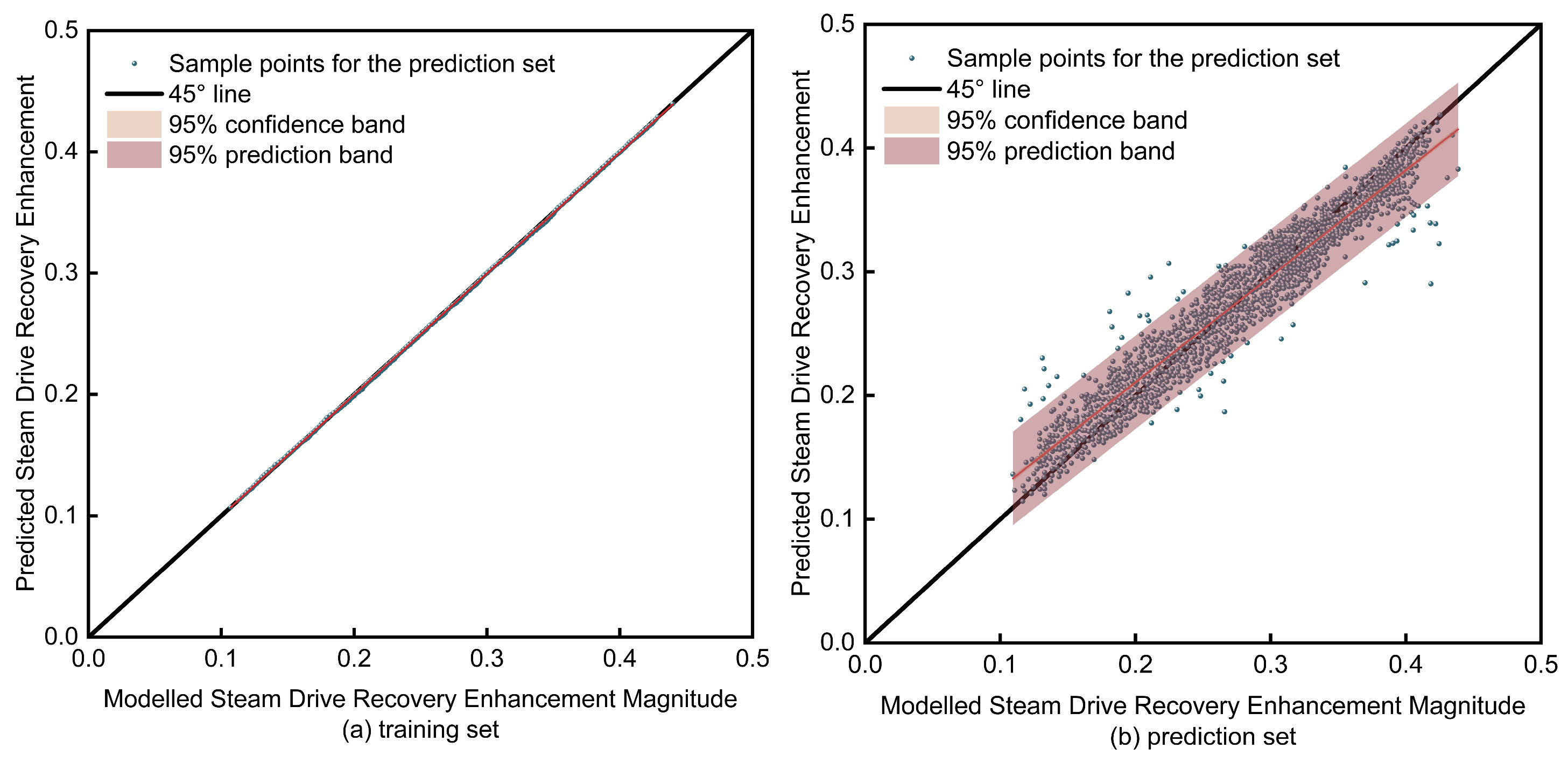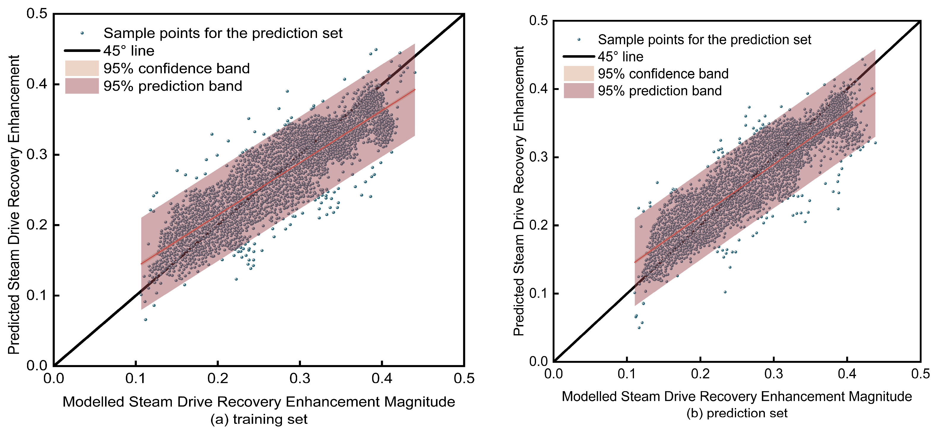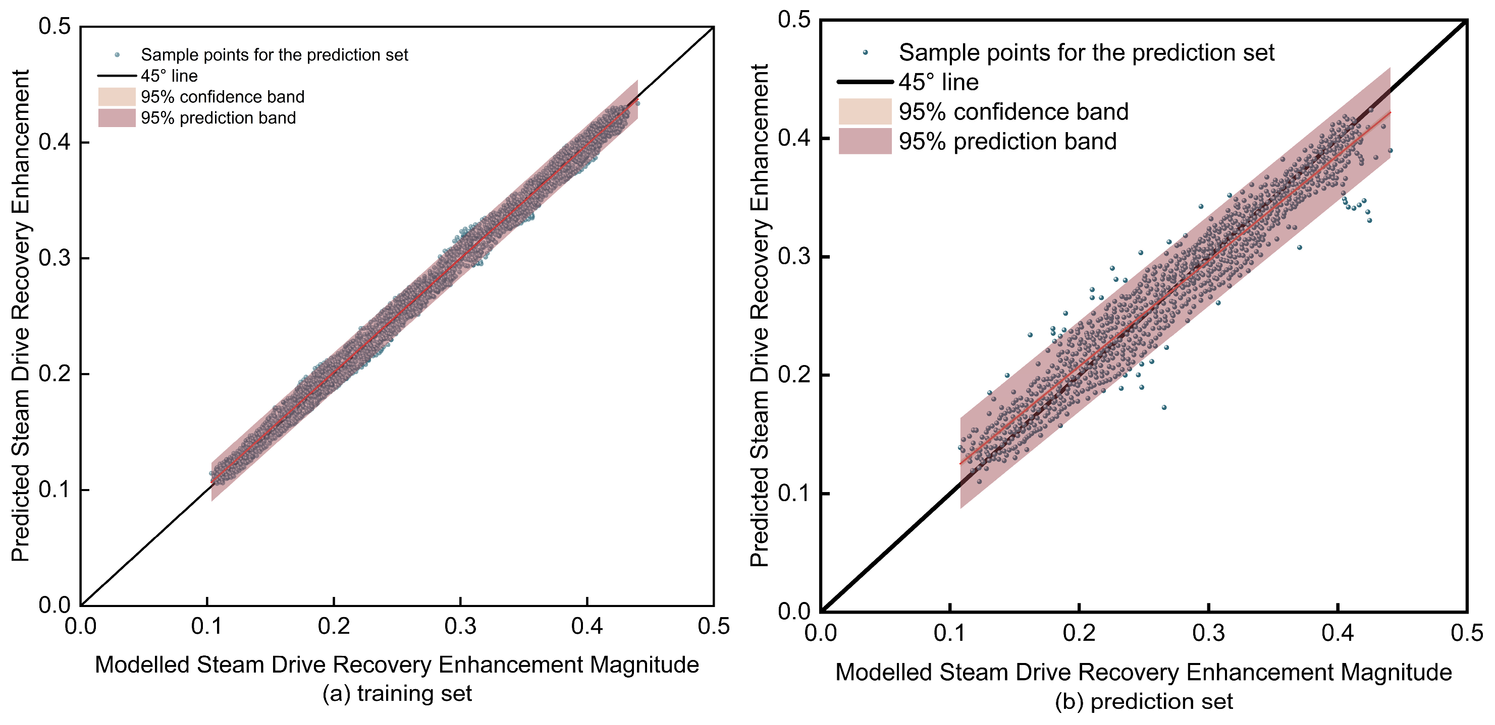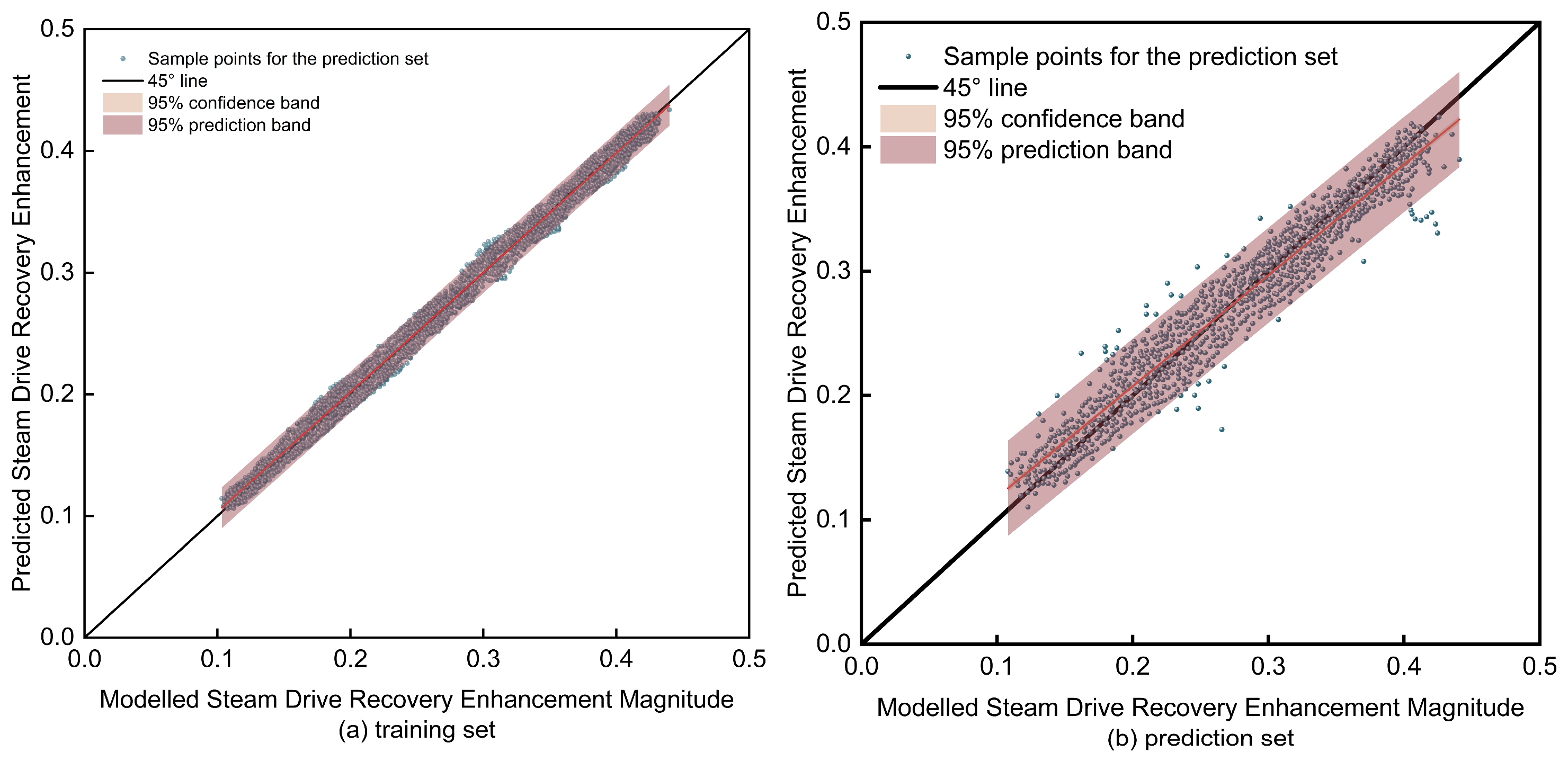 Scatter plot of LightGBM-predicted vs. actual steam-drive potential: (a) training set; (b) prediction set.