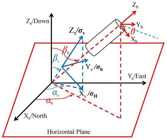 Based on the above definitions, according to coordinate transformation theory, the in situ stresses are transformed into the geodetic coordinate system, as shown in Equation (1):