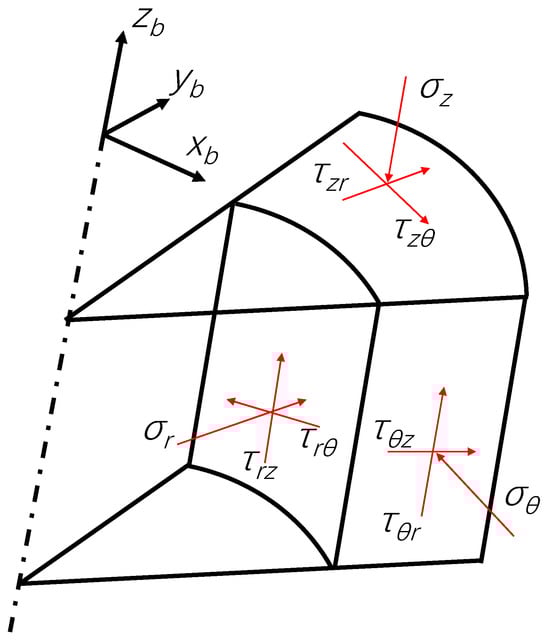 Through coordinate transformation from Cartesian to polar systems, the in situ stresses defined in the wellbore Cartesian coordinate system (Equation (5)) are transformed into the corresponding stress components in the wellbore polar coordinate system, as expressed in Equation (7). This equation describes the stress state in polar coordinates at any point within the formation prior to drilling:
