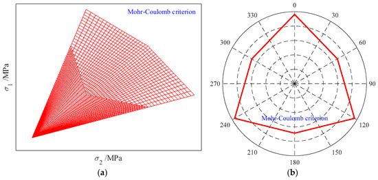Figure 5a depicts the yield surface of the Mohr–Coulomb criterion in principal stress space, which forms a hexagonal pyramid. The meridian varies linearly with increasing hydrostatic pressure. At constant hydrostatic pressure, the corresponding yield curve of the Mohr–Coulomb criterion on the π-plane is shown in Figure 5b. The yield curve is a hexagon with six inflection points, and its shape remains unchanged on this plane under different hydrostatic pressures.