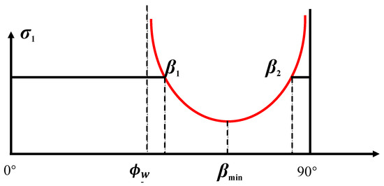 According to the Single Plane of Weakness Criterion, the variation trend of rock strength with the angle β is shown in Figure 6. Based on the physical meaning and geometric characteristics of the Mohr circle, the upper and lower bounds of the angle between the normal to the fracture plane and the maximum principal stress—for slip failure along that plane—are functions of the internal friction angle of the fracture surface, as expressed by Equation (12):