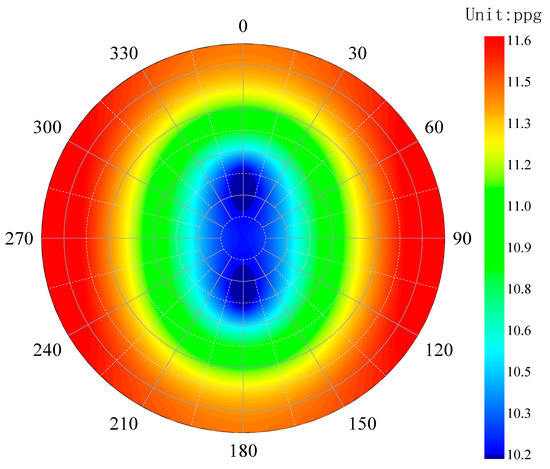 In this study, the computational results from Lee et al. [55] were used as the benchmark. The parameters listed in Table 1 of their work were input into the computational program developed in this study. Using the Mohr–Coulomb criterion as the failure criterion, the collapse pressure of the wellbore for arbitrary trajectories was calculated, and a contour map of wellbore collapse pressure was generated. The computational results are shown in Figure 8.