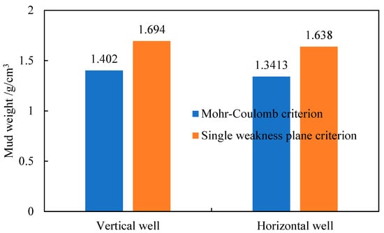 The bar chart in Figure 12 compares the lower limits of the safe drilling fluid density window for vertical and horizontal wells predicted using the Mohr–Coulomb criterion and the Single Weak Plane Criterion. The results indicate that disregarding the impact of fractures on wellbore stability would yield a recommended drilling fluid density of 1.55 g/cm3 to prevent collapse. However, when considering the extensively developed fractures in the formation, the Single Weak Plane Criterion shows that a higher density of 1.638 g/cm3 is required to ensure stability in the horizontal wellbore. The actual application of 1.55 g/cm3 resulted in wellbore collapse and instability, which is consistent with field observations and confirms the predictive accuracy of the model.