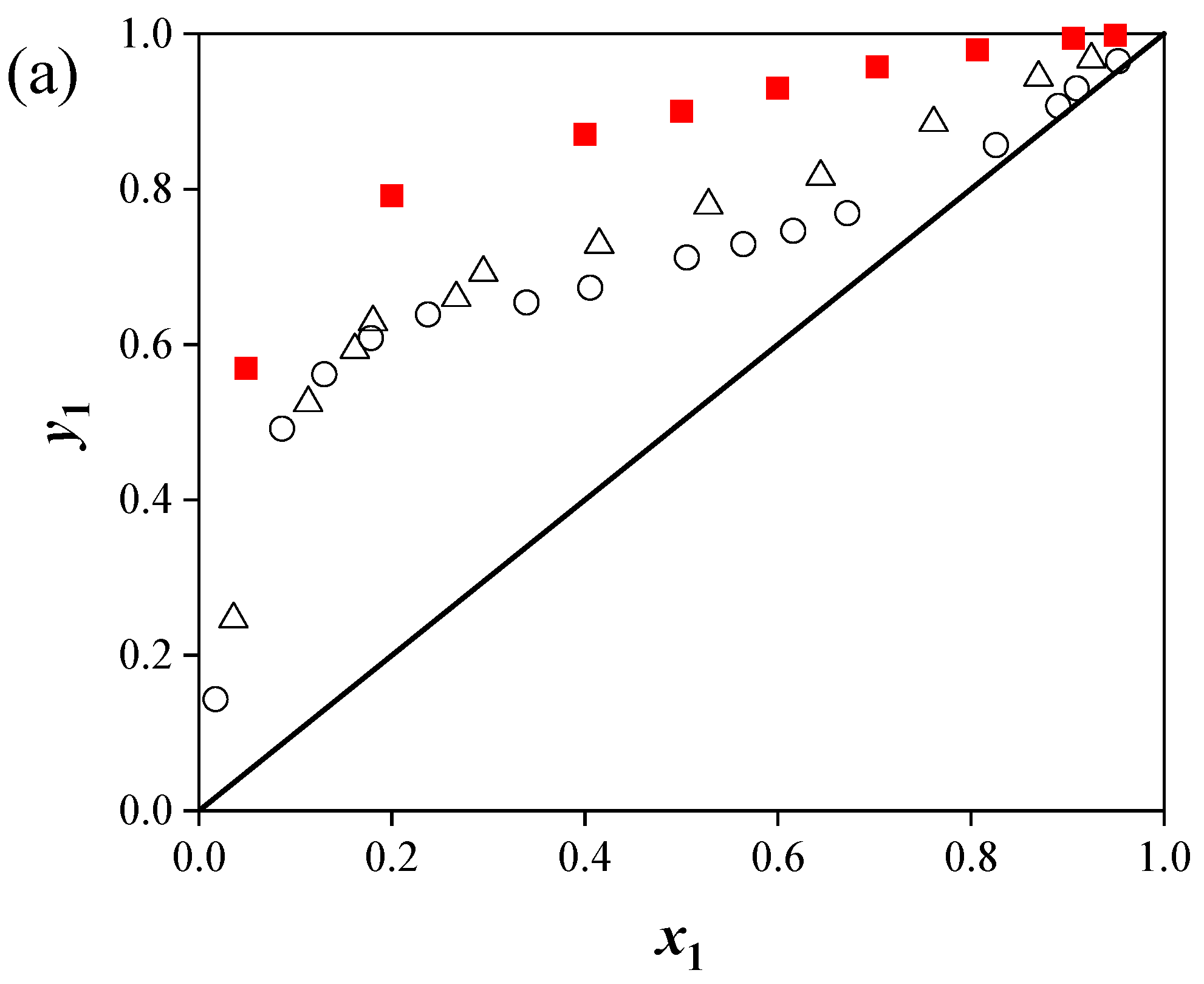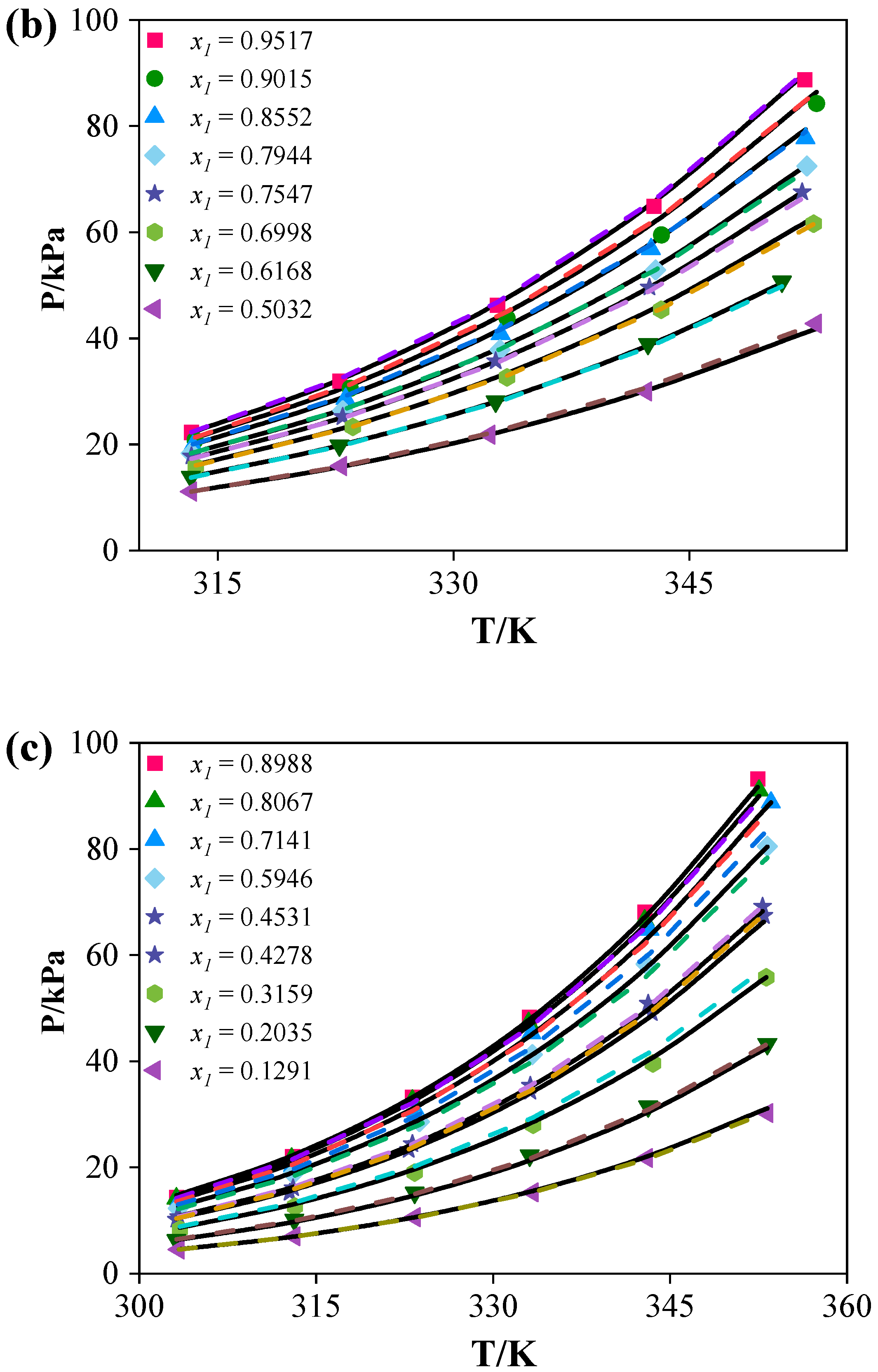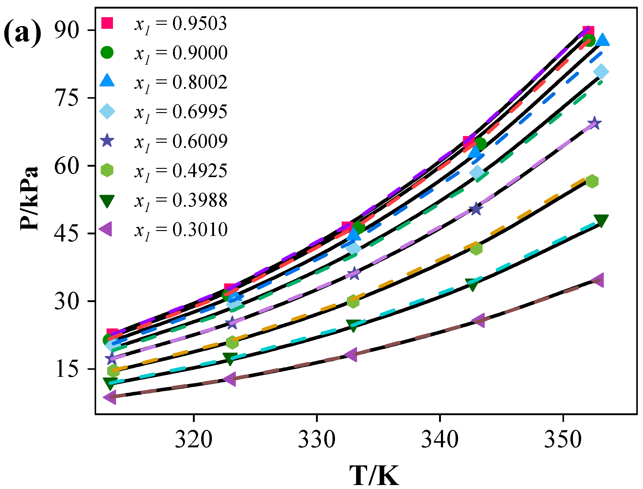 39]. The deviation in the liquid phase composition is mainly from the uncertainty of the balance and the molar fraction values used in the calculation process. The electronic balance had a precision of ±0.1 mg. The deviation in the vapor phase composition primarily results from errors in the measured temperature, pressure, and liquid composition.