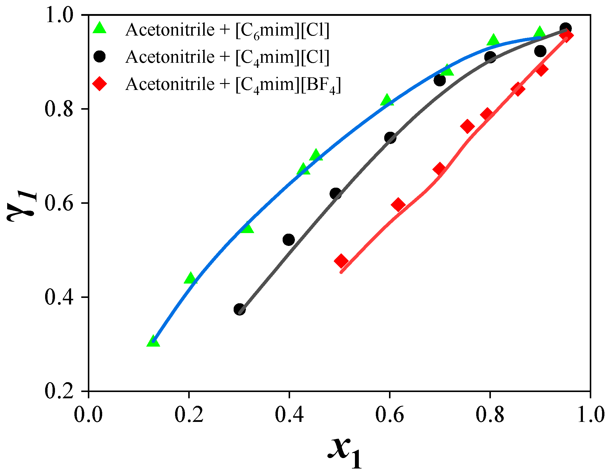 For acetonitrile + IL systems, the volatility of the IL was negligible, and thus the vapor phase was essentially composed entirely of acetonitrile, which simplified the calculations. The ILs used in the experiment were recovered at the end using a rotary evaporator for cost-saving purposes.