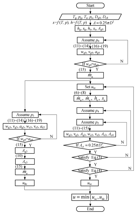 For a vapor that is accelerated from a stagnant state i (i ∈ {g,e,c}) to a certain cross-section j (j ∈ {0,2,3,4}) by its own expansion, the specific enthalpy of primary vapor, secondary vapor, and mixed vapor undergoing an isentropic process can be expressed as follows [18]:
