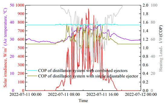 The solar radiation data and temperature data required for the analysis process are derived from the measured meteorological data of Qixing District, Guilin, China. The data of a certain day in summer (11 July 2022) are selected for analysis. The data used consist of 15 min averages and the results are shown in Figure 5. Analysis of Figure 5 shows that when the solar radiation intensity changes, the thermal load required by the vapor ejector in the juice distillation and concentration system will change dramatically. However, from the results, it is found that under the same unstable thermal load requirements, the stability of the performance coefficient of the system using the combined ejector is significantly better than that of the system using a single adjustable ejector; in terms of COP values, the daily average performance coefficient of the system using the combined ejector is 1.54, and the daily average performance coefficient of the system using the single adjustable ejector is 1.17. The performance coefficient of the system using the combined ejector is 31.6% higher than that of the system using the single adjustable ejector.