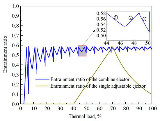 To investigate the reasons for the difference in the COP between the two systems, it is necessary to further discuss the performance of the ejector, which is the component where the two systems differ. In order to make the research conclusion more universal, the value of the thermal load is also converted into a percentage for analysis. By analyzing the entrainment ratio, as shown in Figure 7, for the single adjustable ejector, its effective adjustable range is 40.5–100%; for the combined ejector, its effective adjustable range is 2.53–100%. As the load varies from 0 to 100%, the proposed system achieves an average entrainment ratio of 0.525, with an efficiency not less than 50% of the design value over 95.23% of the range. In contrast, a conventional single continuously adjustable ejector has an average entrainment ratio of 0.177, and the distillation system efficiency remains above 50% of the design value for only 25.32% of the range. It can be seen that while the combined ejector can achieve full thermal load range adjustment, it can also ensure a larger effective adjustable load range. The combined ejector can obtain a higher entrainment ratio in a larger load range.