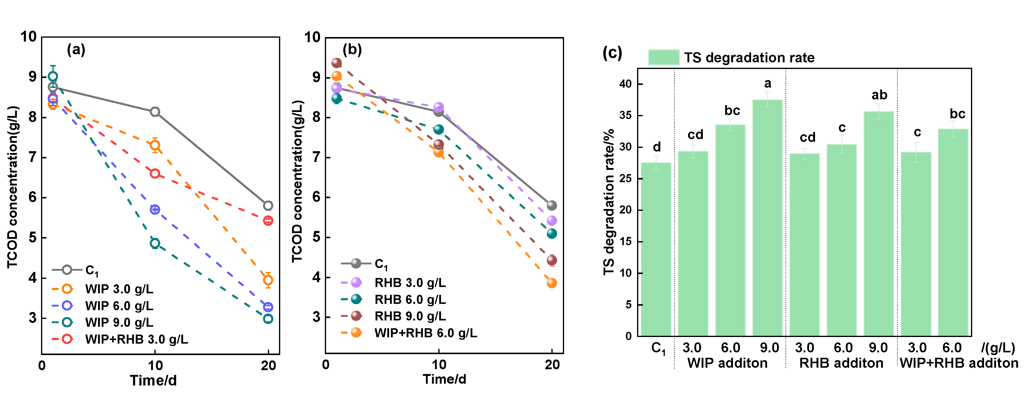 3.3.3. TCOD Concentration and TS Degradation Rate