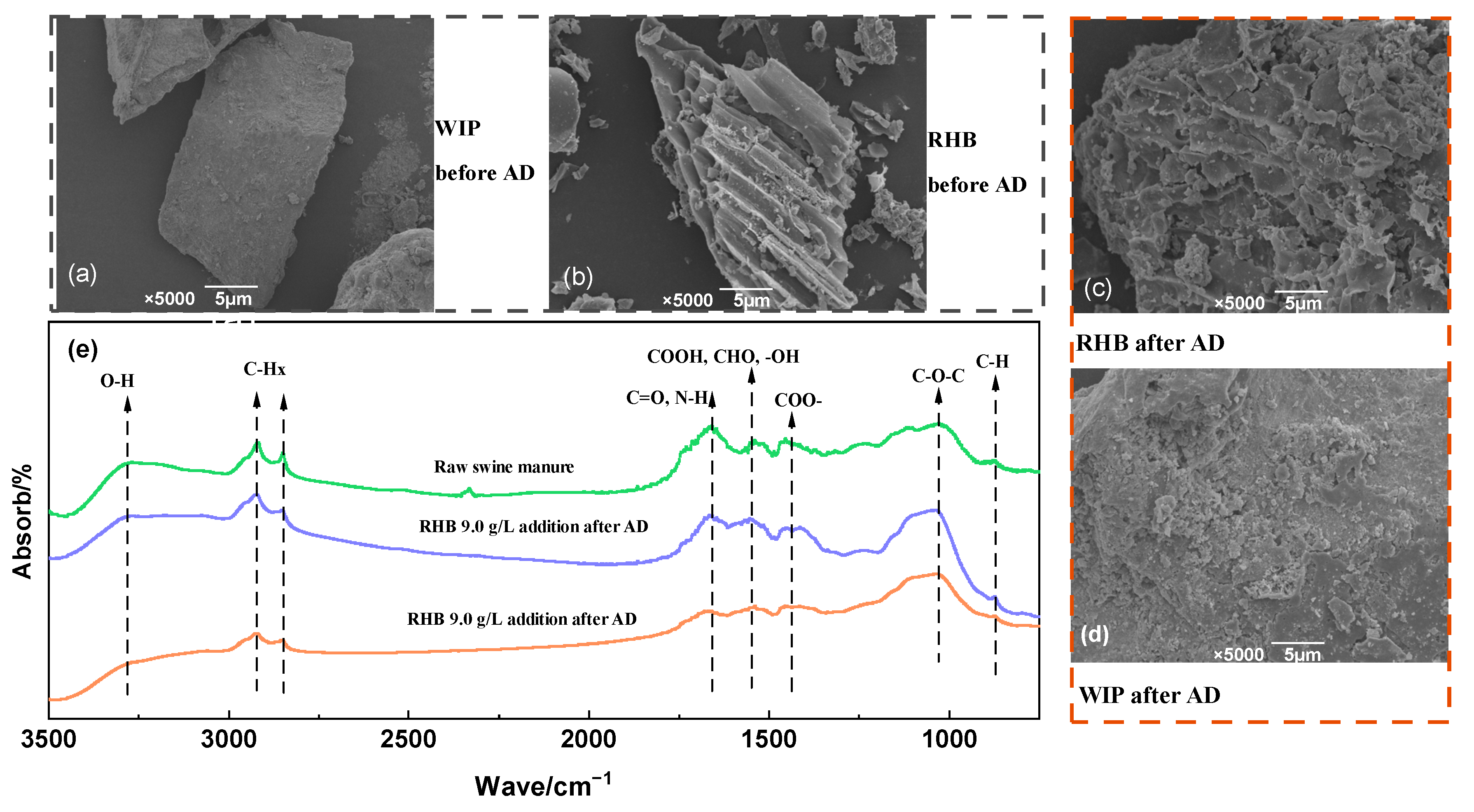 3.4. Surface Changes in RHB and WIP and Analysis of Functional Groups in Swine Manure