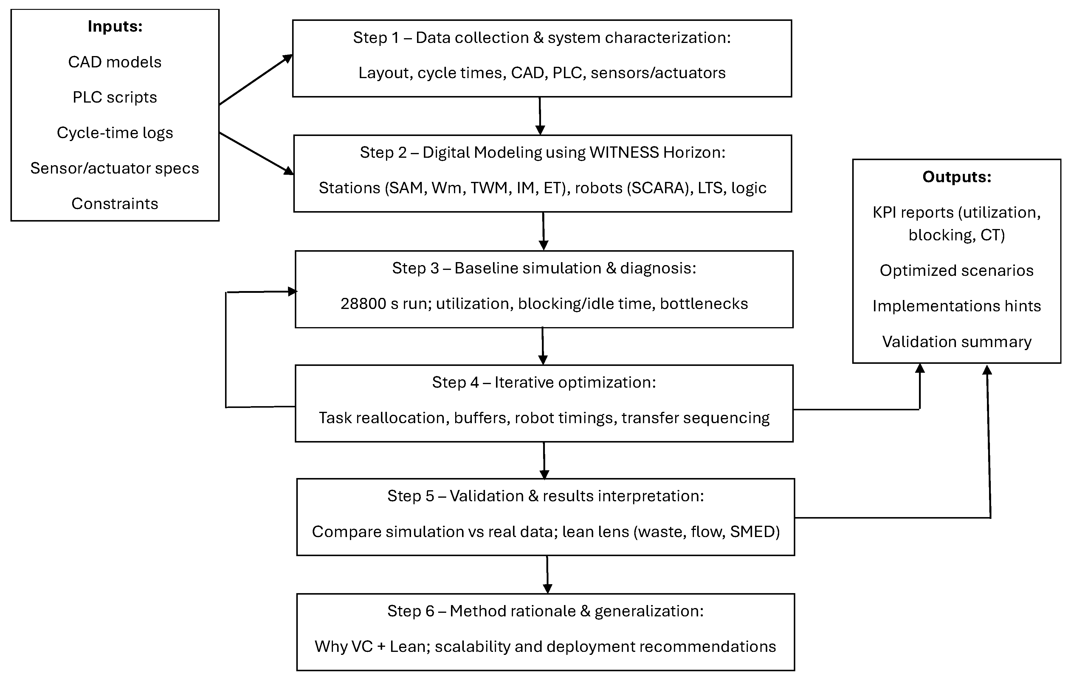 - Method rationale and generalization: VC enables safe, low-disruption testing of alternatives in systems with tight mechanical/robotic couplings and complex interlocks. The workflow generalizes to other electromechanical assembly lines by reusing the data → model → diagnosis → optimization → validation loop and the same KPI structure.