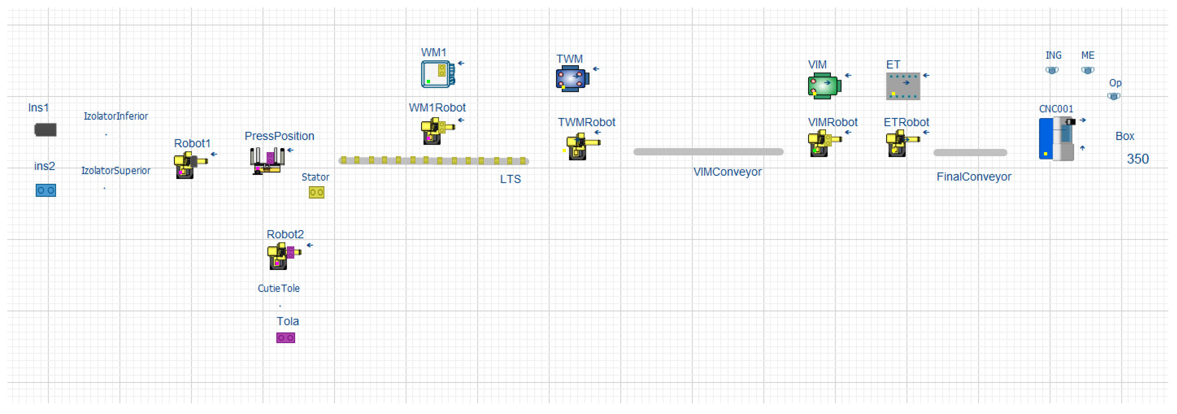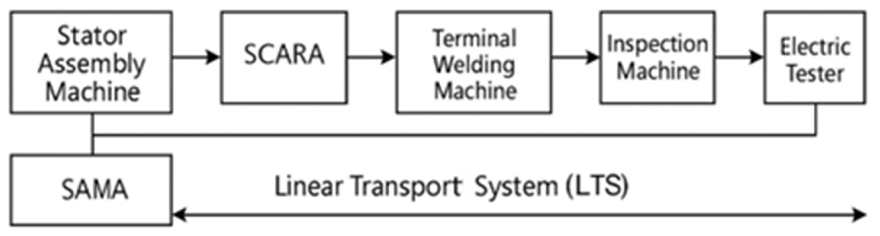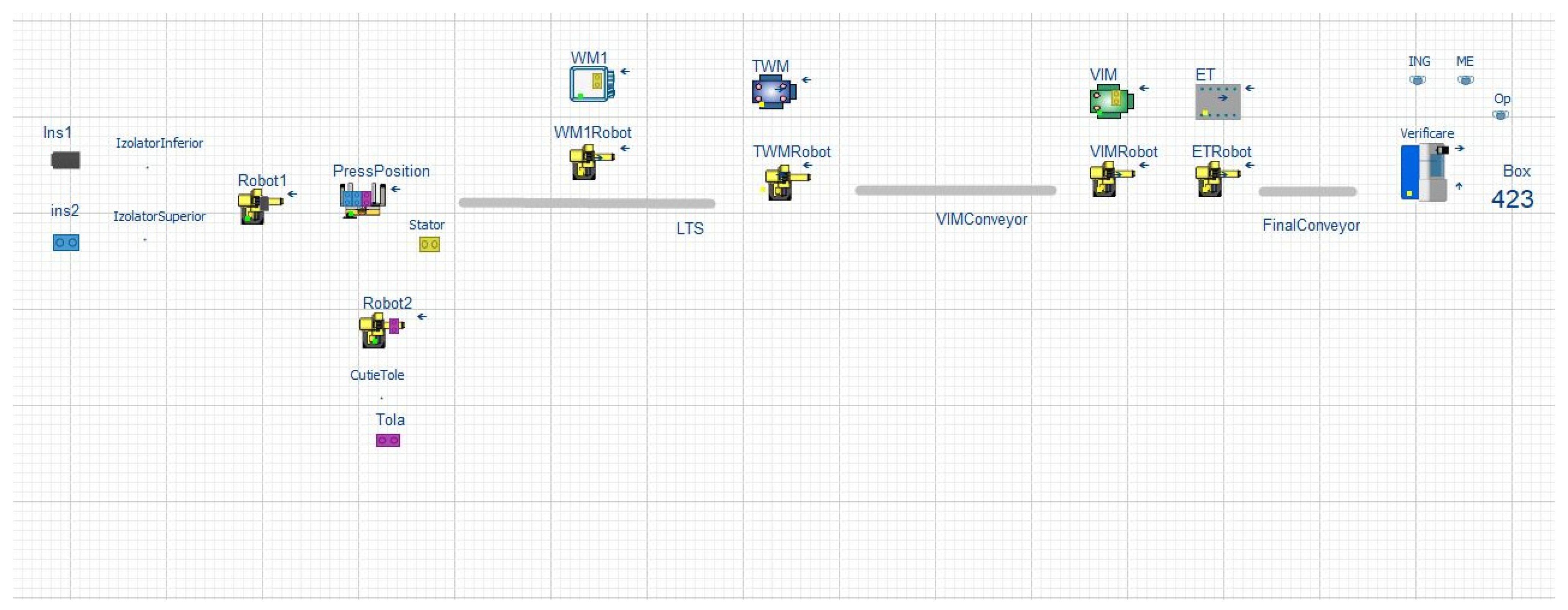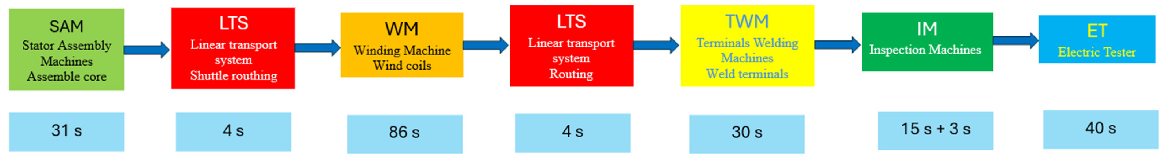 - Digital Modeling using WITNESS Horizon: A discrete-event model was developed, including stations SAM (Stator Assembly Machine), WM (Winding Machines), TWM (Terminal Welding Machine), IM/VIM (Inspection/Visual Inspection), and ET (Electric Tester); SCARA robots; and buffers and Linear Transport System (LTS). Logical interlocks and routing rules were encoded to mirror real control behavior.