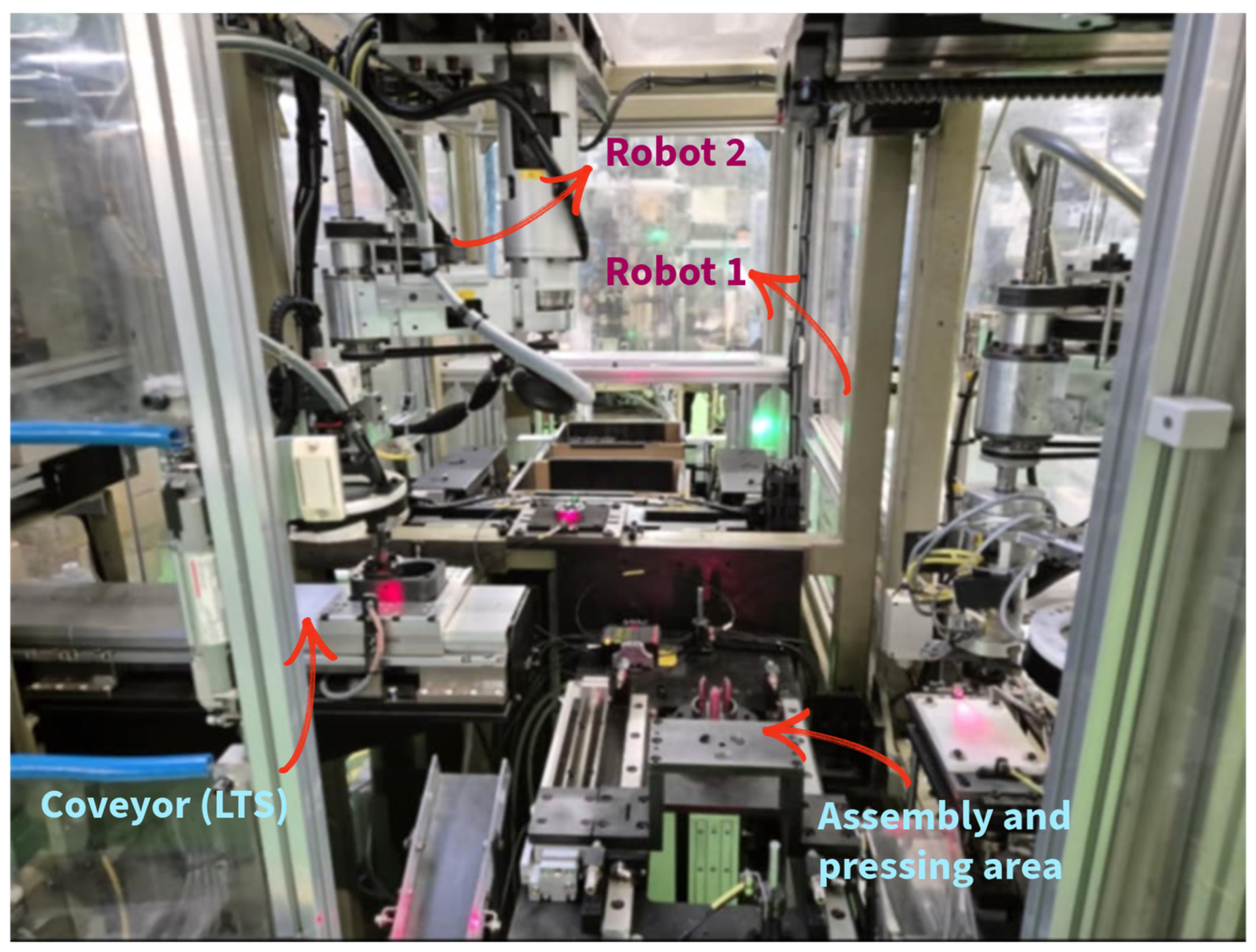 - Collecting Data and Analyzing System Features: We gathered the physical layout, cycle-time logs, CAD models, PLC/robot programs, and sensor/actuator specifications. Operational constraints (space, safety, takt, and quality) were recorded. Key performance indicators (KPIs) were defined: resource utilization, blocking/idle time, throughput, and work-in-process (WIP).