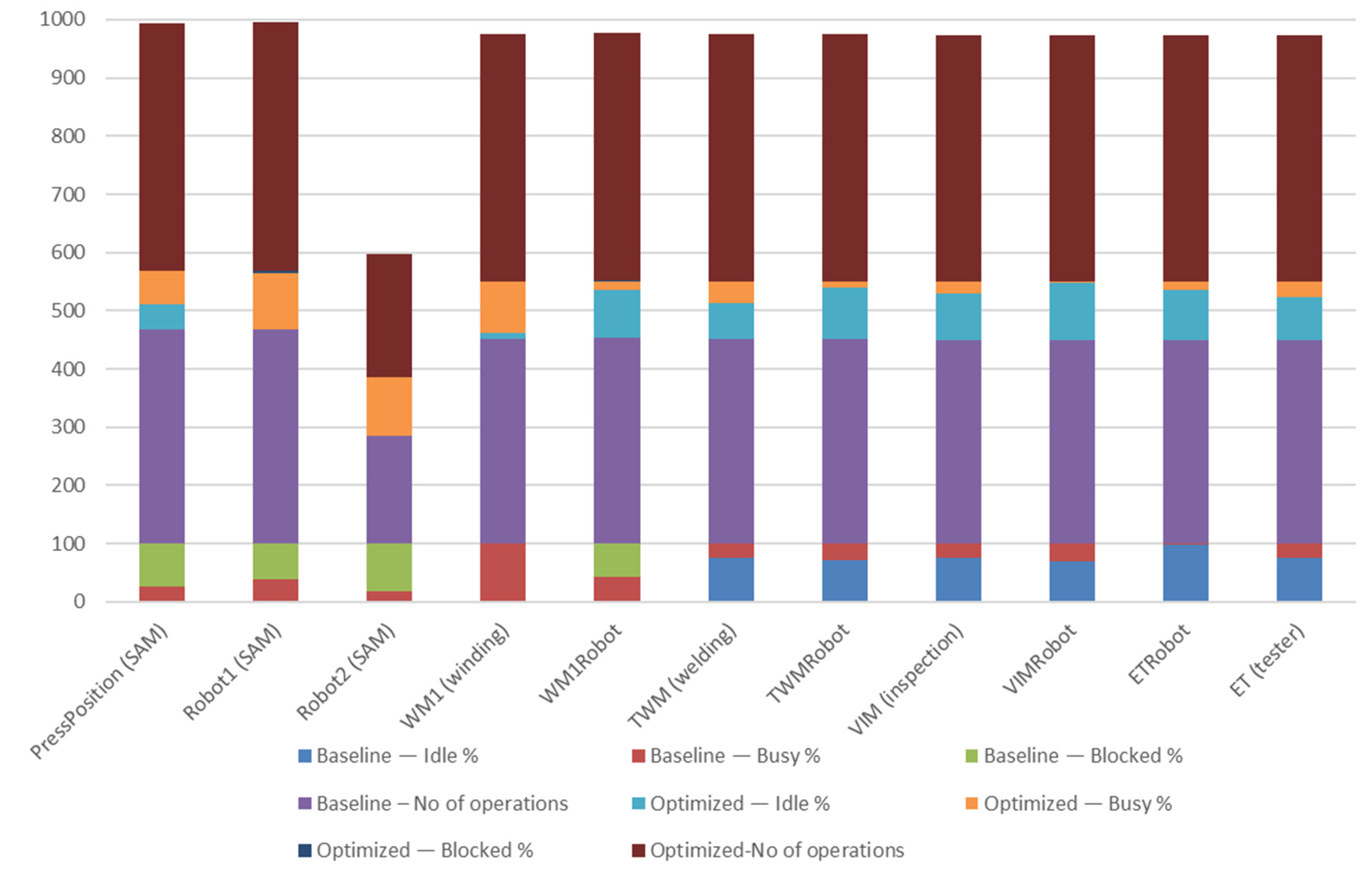 | Asset | Baseline—Idle % | Baseline—Busy % | Baseline—Blocked % | Baseline—No. of Operations | Optimized—Idle % | Optimized—Busy % | Optimized—Blocked % | Optimized—No. of Operations |