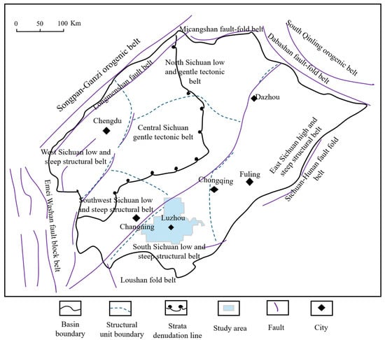 This study uses the wellbore trajectory data of a well in the Luzhou block as a verification object. The study area is located in the southern Sichuan Basin’s Luzhou block, geologically be-longing to the low-steep structural belt of southern Sichuan, situated on the southern side of the central Sichuan paleo-uplift [], as shown in Figure 3. The geological structure of the region is formed by base fault activities from deep to shallow layers, predominantly composed of fold structures controlled by concealed faults [].