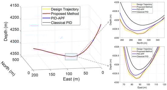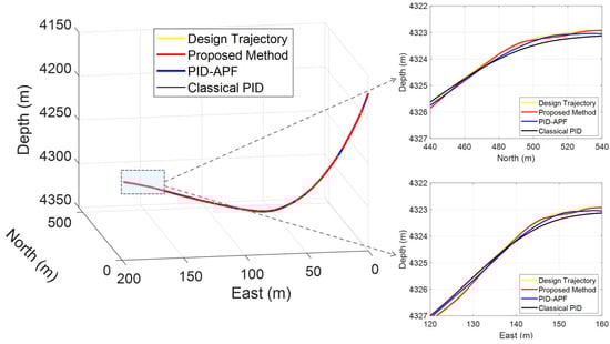 Figure 4 illustrates the spatial comparison between the actual trajectories generated by the three control methods and the designed trajectory within the depth interval of [4255 m, 4275 m]. The results show that the trajectories produced by the proposed method and the classical PID method are highly consistent with the designed trajectory, exhibiting almost no noticeable deviation. This can be attributed to the relatively smooth variation in the designed trajectory in this interval. In contrast, the trajectory generated by the PID-APF method shows significant deviation from the designed trajectory. The underlying reason is that the PID-APF approach adjusts PID parameters using the artificial potential field, in which virtual “attractive” and “repulsive” forces are introduced to guide the trajectory toward the target. However, this mechanism is prone to the formation of local equilibrium points, preventing the trajectory from fully coinciding with the designed trajectory.