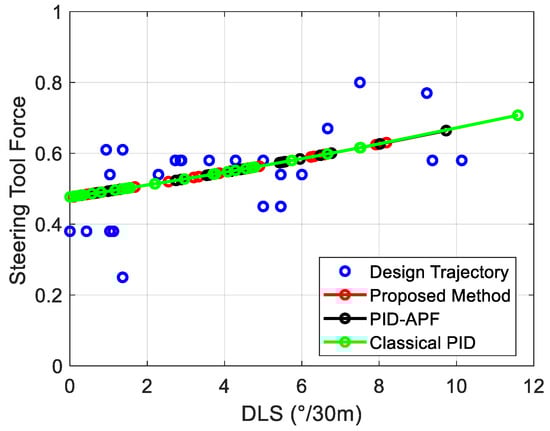 where represents the steering tool force, and represents the DLS. Although the fitting accuracy is relatively limited, the function effectively reflects the overall trend of the relationship between DLS and steering tool force (as shown in Figure A1), providing a reference for subsequent control strategies.