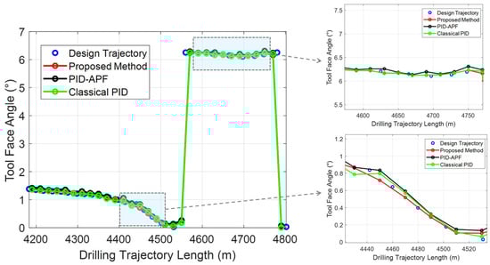 Figure 7 illustrates the relationship between DLS and steering tool force for the three control methods. The results indicate that the steering tool force of the proposed method are largely concentrated within the dense region of the designed trajectory, demonstrating strong consistency. In contrast, portions of the steering tool force generated by the two comparative methods deviate significantly from this region. This finding highlights the superior capability of the proposed method to maintain trajectory smoothness and reasonable control input, thereby achieving improved trajectory-tracking performance under complex conditions. In addition, Figure 8 presents the comparative results of tool face angle variations under different drilling depths for the three control methods. It can be observed that the tool face angle curve generated by the proposed method aligns closely with the designed trajectory across all depths, with the agreement being more evident in the enlarged subfigures on the right. This demonstrates the high attitude-control accuracy achieved by the proposed method.