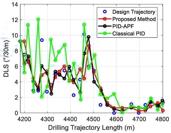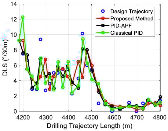 In addition, Figure 10 illustrates the distribution of DLS for the designed trajectory, the proposed method, and the two comparative methods under different drilling lengths. From the overall trend, the DLS curve generated by the proposed method is smoother, with smaller fluctuations, thereby demonstrating stronger trajectory-fitting capability and attitude-control stability. According to the statistical results in Table 4, the average DLS of the proposed method throughout the drilling process is 3.6378 (°/30 m), which is significantly lower than those of the classical PID and PID-APF methods, with reductions of 6.30% and 5.81%, respectively. These findings further confirm the superiority of the proposed method in maintaining attitude stability and controlling trajectory smoothness.