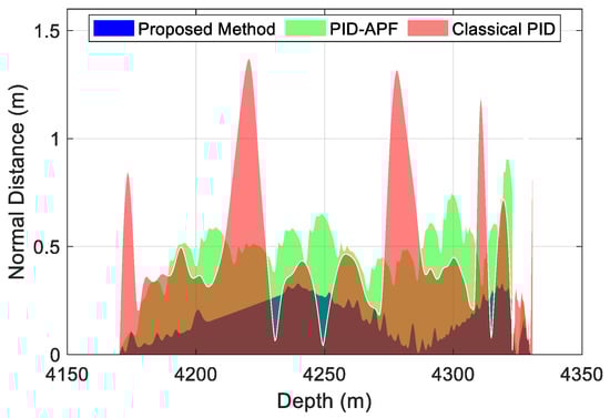 Figure 9 provides a clear illustration of the differences in normal distance among the three control methods under varying true vertical depths. It can be observed that, compared with the two benchmark methods, the proposed approach consistently achieves smaller normal distances across most depth intervals. Although slight fluctuations are present in certain segments, the overall deviation remains within 0.15 m. As further confirmed by the statistical results in Table 4, the proposed method yields an average normal distance of only 0.1534 m throughout the entire drilling process, which is significantly lower than those of the classical PID and PID-APF methods, with accuracy improvements of 88.89% and 34.02%, respectively.