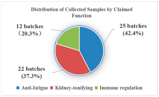 The samples covered a wide range of brands and health-function claims (e.g., antifatigue, kidney-tonifying, and immune regulation). The claimed functions, specifications, purchase sources, and detection results of the individual samples are provided in Table 1. The distribution of samples by claimed function is detailed in Figure 2.