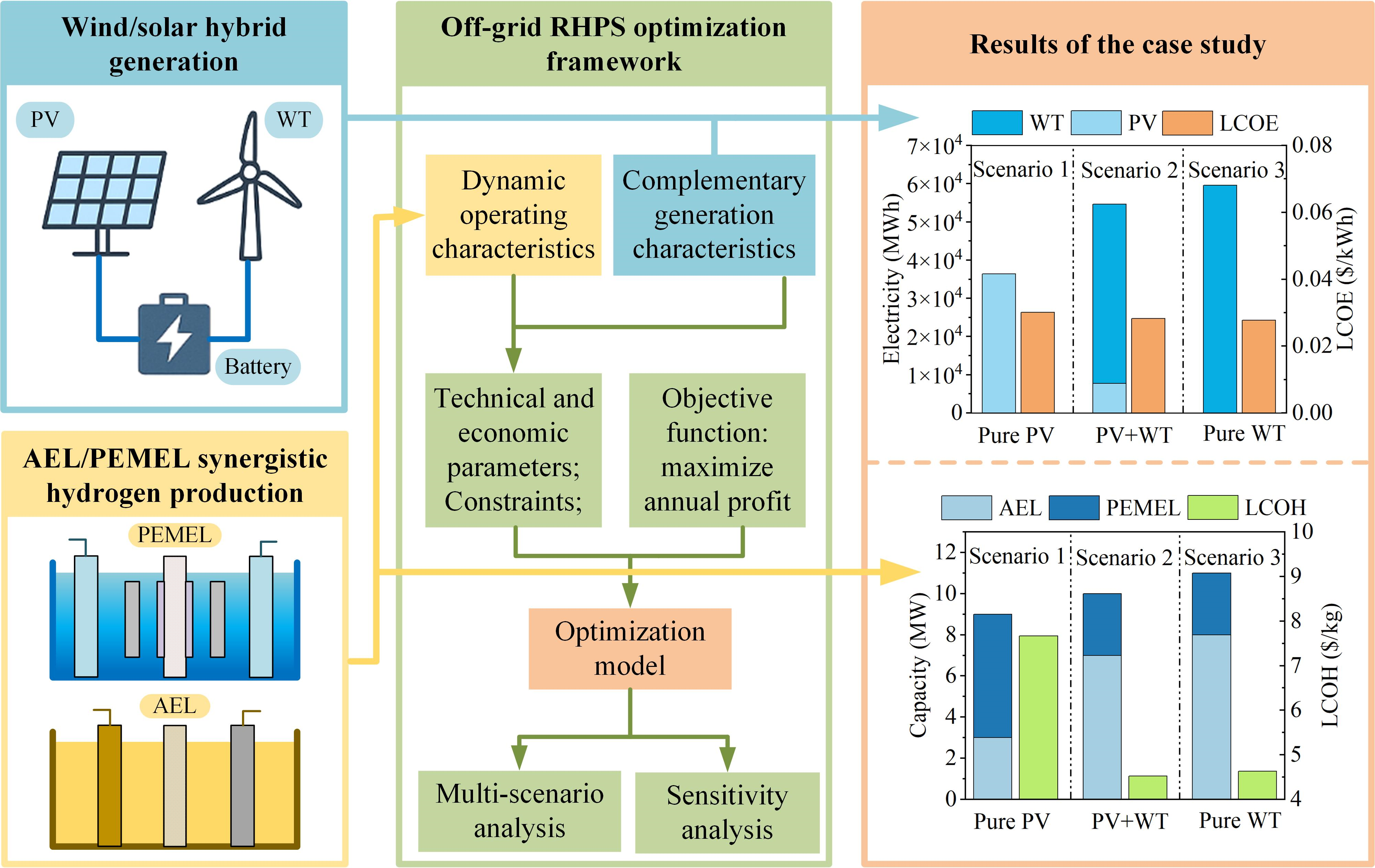 Therefore, current designs of RHPS encounter three fundamental constraints: (1) a predominant focus on single renewable sources or electrolyzer types, neglecting multi-energy complementarity and multi-electrolyzer techno-economic synergies; (2) the inadequate modeling of dynamic source-load matching; and (3) the oversimplification of electrolyzer efficiency as static rather than power-dependent. These constraints significantly undermine both the operational performance and economic feasibility of such systems. To address these shortcomings, this study contributes in the following ways: First, we propose a collaborative optimization framework for off-grid RHPS that incorporates spatio-temporal wind–solar complementarity alongside the techno-economic characteristics of AEL and PEMEL. Our model integrates the dynamic operational behavior of electrolyzers to harmonize the intermittency of renewable energy with the response profiles of AEL and PEMEL, thereby facilitating dynamic load distribution between the two technologies. Second, joint optimization is employed to ascertain optimal wind turbine-to-photovoltaic (WT-PV) ratios, types and capacities of electrolyzers, and the economic performance metrics of the system. Third, sensitivity analyses are conducted to quantify the effects of fluctuations in the capital costs of BESS and PEMEL on system configuration and revenue generation.