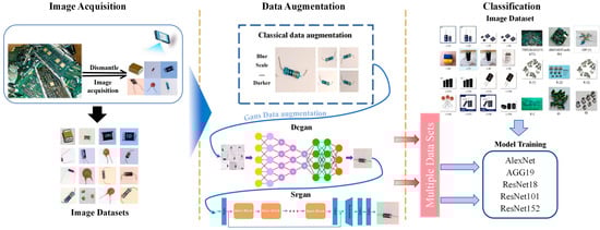 Image classification is a technical process that assigns an image to a predefined label based on its visual content and has been widely applied in medical-image analysis, autonomous-driving perception, industrial quality inspection, and remote-sensing land-cover recognition [16,17]. Electronic-component classification analogously labels components according to differences in their physical characteristics and model specifications. Traditional manual sorting relies on naked-eye inspection and subjective experience to place components into designated collection containers, inherently suffering from low throughput, poor consistency, and high labor intensity [18]. With the massive retirement of WPCBs products, this conventional approach can no longer meet the requirements of large-scale, high-precision processing. Prior studies have demonstrated the successful application of machine learning methods, such as decision trees and support vector machines, for specific component recognition [19]. However, the machine learning methods require high-resolution images and manual feature engineering and have limitations in terms of processing speed and data dependency. Deep learning algorithms have provided efficient, flexible, and cost-effective solutions in the field of image processing. Foo et al. [20] employed convolutional neural networks (CNNs) to identify and classify mixed components, thereby improving the e-waste processing efficiency. Furthermore, improved models incorporating 3D shape features have enhanced the accuracy of complex component identification [21]. Lu et al. [22] developed an automated sorting system that utilizes deep learning techniques to automatically identify and classify e-waste components. However, high-performance models typically require a large number of training images, which is a significant challenge due to the scarcity of image data corresponding to e-waste components.