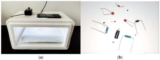 Electronic component image acquisition system: (a) Homemade image acquisition box. (b) Various images of used electronic components.