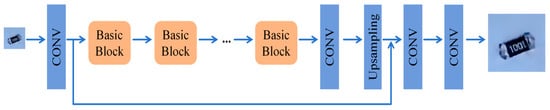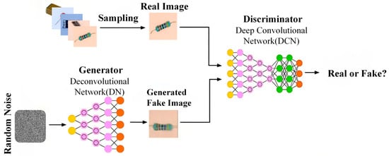 Despite the improved stability and image quality of DCGAN compared to standard GANs, it still has limited capability to generate detailed features and color characteristics of electronic components. Recent research has proposed SRGAN, which is emerging as a widely adopted solution to address these shortcomings [38]. The underlying principles of SRGAN are rooted in the GAN framework, leveraging perceptual and adversarial losses to significantly enhance the image super-resolution quality [39]. This approach has demonstrated efficacy in generating high-fidelity, detail-rich images. The SRGAN generator employs deep residual networks (Residual Blocks) to extract multi-level features from low-resolution images, utilizing upsampling layers to elevate these features to the target resolution [40]. Perceptual loss is a critical component of this process, which employs high-level feature representations from a VGG network to ensure that the generated high-resolution images approximate the real images at the pixel level while simultaneously aligning with human visual perception [41,42]. Furthermore, as shown in Figure 6, the discriminator uses adversarial training to optimize the generator’s performance, resulting in richer and more natural texture details in the generated images [43].