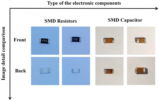 Several WPCBs populated with SMD resistors, SMD capacitors, through-hole resistors, through-hole capacitors, and diodes are manually selected. Subsequently, a hot air gun is utilized to manually remove the required electronic components from the WPCBs. This paper focuses on three specifications of SMD resistors: 0603, 0805 and 1206. Different resistor models have different dimensions, as illustrated in Table 1. In the constructed image dataset, resistance values of 510 Ω, 470 Ω and 1 kΩ are included. Through-hole resistors with values of 330 Ω, 510 Ω, 10 kΩ and 4.7 kΩ, a power rating of 0.5 W, and a resistance tolerance of 1% are also selected. Selected through-hole capacitors include electrolytic and ceramic capacitors, while SMD capacitors of various sizes are used. Diodes include zener diodes and rectifier diodes. Figure 7 shows that the front faces of SMD resistors display their unique resistance value and characteristics, while their rear faces exhibit uniform characteristics. On the other hand, both faces of SMD capacitors exhibited identical characteristics. The creation of a dataset for through-hole components involved high complexity and diversity. This complexity arose from the varying degrees of bending caused by various factors in the component leads. Furthermore, the printed text on the component surfaces could be distorted or faded due to various reasons, which resulted in the enhancement of the dataset’s diversity.