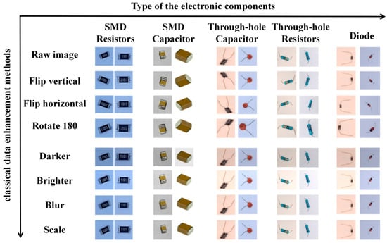 Considering the requirements of electronic component feature extraction outlined in Section 2.2 and the limitations of classical data augmentation techniques, this experiment exclusively employs blurring, brightening, darkening, horizontal flipping, vertical flipping, 180-degree rotation, and scaling methods. These classical enhancements are used to augment the original dataset of 1610 images sevenfold, producing a total of 11,270 images. The two types of images are mixed to form a new dataset, namely Dataset II, with a total of 12,880 images. It is observed that blurring, brightening, and darkening methods modify the original images. Consequently, fundamental features on the electronic components, such as numerals and color band colors, become blurred, darker, or more vivid, which results in a more effective simulation of real-world conditions. Conversely, flipping and rotation do not alter the fundamental features of the original images, as illustrated in Figure 8. The aforementioned classical image augmentation techniques significantly increase the diversity of the dataset.