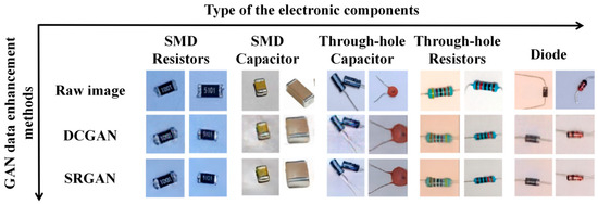 The experimental results obtained in this study indicated that the combination of classical data augmentation methods with GAN-based data augmentation methods effectively optimized data augmentation outcomes. During the image generation process, the DCGAN and SRGAN successfully retained key feature information of electronic component images, such as texture, color, contour, and edge details, ensuring the authenticity and diversity of the generated data. Additionally, experiments conducted on five distinct deep learning classification models demonstrated that data augmentation substantially boosted the classification performance of these models. Notably, the proposed GAN-based DA method outperformed classical DA methods, with the ResNet series models exhibiting particularly prominent performance improvements. Further analysis indicated that hybrid DA, namely the integration of GAN-generated images and classical DA, yielded the highest classification accuracy during model training, as this approach effectively enhanced the diversity of the image dataset. Finally, results based on the PSNR and SSIM evaluation of the quality of generated images showed that the GAN-generated images and real images exhibited similar feature distributions, ensuring the reliability of classification task results.