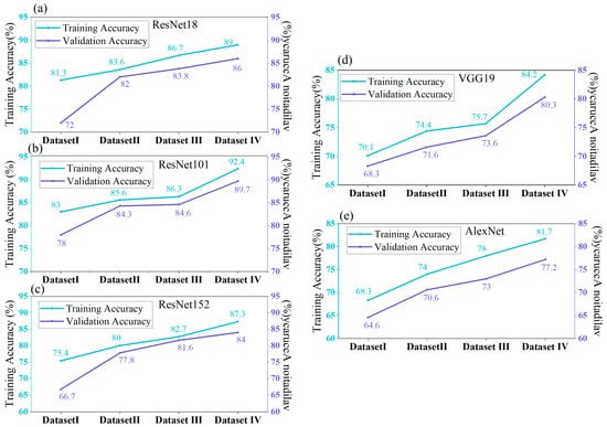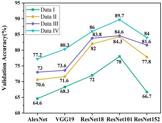 Furthermore, the validation accuracies of ResNet101, ResNet18, ResNet152, VGG19, and AlexNet on Dataset IV are the highest at 89.7%, 86%, 84%, 80.3%, and 77.2%, respectively. These results surpass those obtained on Dataset III by 5.1%, 2.2%, 2.4%, 6.7%, and 4.2%, respectively; on Dataset II by 5.4%, 4%, 6.2%, 8.7%, and 6.6%, respectively; and on Dataset I by 11.7%, 14%, 17.3%, 12%, and 12.6%, respectively, demonstrating a significant improvement in the classification accuracy.