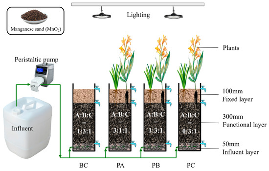 Eight laboratory-scale vertical flow constructed wetlands (VFCWs) were established in this study. Each VFCW unit was constructed using a polyvinyl chloride (PVC) column with an internal diameter of 16 cm and a height of 50 cm. A schematic diagram illustrating the setup of the VFCW units is presented in Figure 1. The substrate was configured with a layered structure: a 5-cm thick supporting layer of gravel (8–12 mm in diameter) at the bottom, a 30-cm thick functional layer consisting of a mixture of natural manganese sand, zeolite, and ceramsite (4–8 mm in diameter) at different mass ratios (see Table 1), and a 10-cm thick top layer of fine sand and gravel (<2 mm in diameter) for plant root stabilization. Natural manganese sand is primarily composed of manganese oxides (MnOx). Under the wetland conditions, these oxides can release divalent manganese ions (Mn2+), a bioavailable form of manganese that plays a role in various microbial and plant physiological processes.