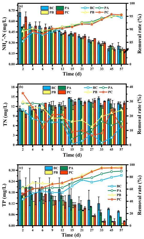 Figure 2. Temporal variations in (a) NH4+-N, (b) TN, and (c) TP concentrations and their removal efficiency under different manganese sand proportions. For clarity, the time series displays a curated selection of data points at varying intervals to illustrate key dynamic trends and the establishment of stable performance.