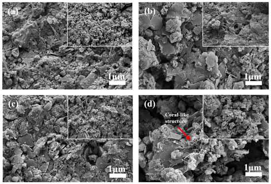 The surface morphology of the manganese sand substrate was examined using scanning electron microscopy (SEM) to visualize microstructural differences. SEM revealed distinct changes in the surface morphology of the manganese sand substrate across different treatments (Figure 3). The pristine manganese sand exhibited a rough, granular surface with uniformly distributed pores (Figure 3a). After the experimental period, the substrate from the unplanted control unit (BC) displayed a smoother surface with evident pore blockage or enlargement (Figure 3b). Among the planted units, the substrate with a high manganese sand proportion (60%, PA) was largely covered by dense sediment deposits (Figure 3c). In contrast, the substrate from the PB unit (20% manganese sand) developed a distinctive, highly porous coral-like structure, which was extensively colonized by a dense microbial biofilm (Figure 3d).