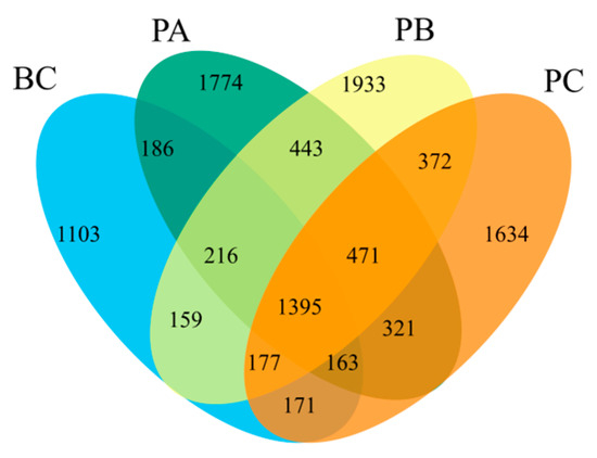 Venn diagram analysis (Figure 6) revealed 1395 OTUs common to all units. The number of unique OTUs was highest in the PB unit (1933), followed by the PA (1774), PC (1634), and BC (1103) units. This result indicates that the 20% manganese sand proportion (PB unit) fostered the most distinct microbial community by supporting the highest number of niche-specific species, which contributed to its unique functional profile.