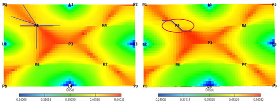 Figure 2 shows the distribution map of the remaining oil after 10 years of normal production without repeated fracturing production and the distribution map of the remaining oil after 4 years of normal production and 10 years of repeated fracturing production in the fifth year. The map shows the final oil saturation of the model production for ten years under the turning angle of −45 degrees. The example is an edge well. From the distribution map of the remaining oil, it can be seen that the remaining oil in the formation is utilized to a greater extent after the fracture turning. The new fractures of re-fracturing can crack and extend in different directions from the previous fractures. A larger range of communication old fractures do not extend to the oil and gas reservoir area to form a high-conductivity oil and gas flow channel to achieve a significant increase in production.