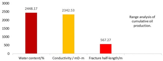 The target well was subjected to temporary plugging and re-fracturing (no water to 40%) at different water cuts. Considering the different fracture half-length (150–230 m) and fracture conductivity (100–300 mD·m) after temporary plugging and re-fracturing, three different parameters were synthesized. The orthogonal design experiment was used to study the optimal parameters under the condition of increasing fracture conductivity and extending fracture length after temporary plugging and re-fracturing. Single factor analysis can only describe its change rule from a certain aspect. Through orthogonal test design, we can understand the influence law of each parameter on development dynamics. Therefore, using the method and idea of orthogonal test design, the level selection and scheme design are carried out for fracture length, conductivity, and temporary plugging re-fracturing time. According to the above single factor analysis, the level of each parameter is selected, and the level of each factor in the corner well is shown in Table 3.