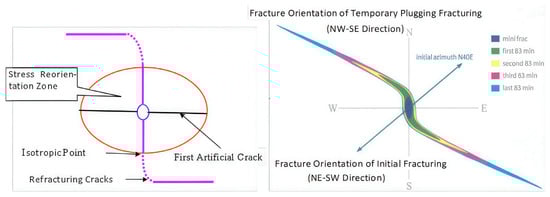 Under specific operational conditions, temporary plugging during re-fracturing operations can modify the orientation and dip angle of hydraulic fractures through diversion mechanisms. This phenomenon primarily results from stress field alterations near pre-existing fractures due to post-initial fracturing production and proppant-filled fractures []. Production activities in fractured wells induce pressure gradient shifts around fractures, leading to reservoir stress redistribution. Adjacent to the fracture surface, vertically oriented tensile stresses develop parallel to the fracture plane, counterbalanced by induced compressive stresses at greater distances. Initially, tensile stresses perpendicular to the fracture plane dominate over those parallel to it. When stress variations induced by pore pressure exceed the initial differential between maximum and minimum horizontal stresses, the original maximum horizontal stress direction transitions to the minimum stress orientation []. Under such conditions, temporary plugging re-fracturing generates fractures oriented perpendicular to the initial fracture geometry.