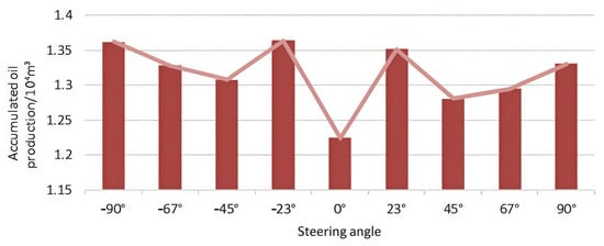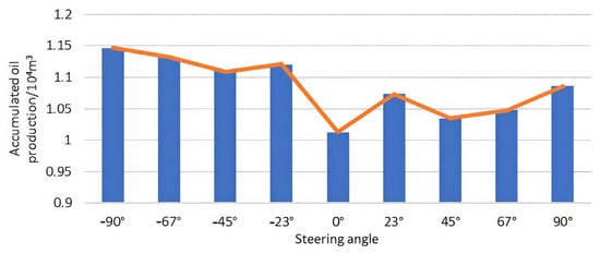 (1) From the analysis of the optimal turning angle of cumulative oil production, the cumulative oil production of oil wells under different fracture turning angles is shown in Figure 10.
