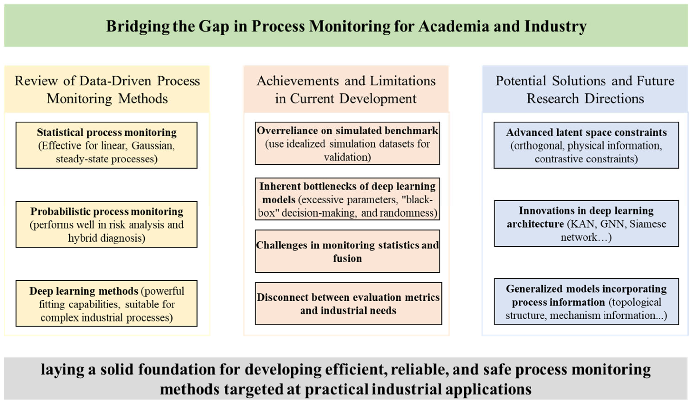 | Process-Information Fusion | Systematic encoding of domain knowledge; Balancing physical constraints with data-driven flexibility | Construction of secondary variables; PINN; GNN | To create models with superior generalization for industrial environments |