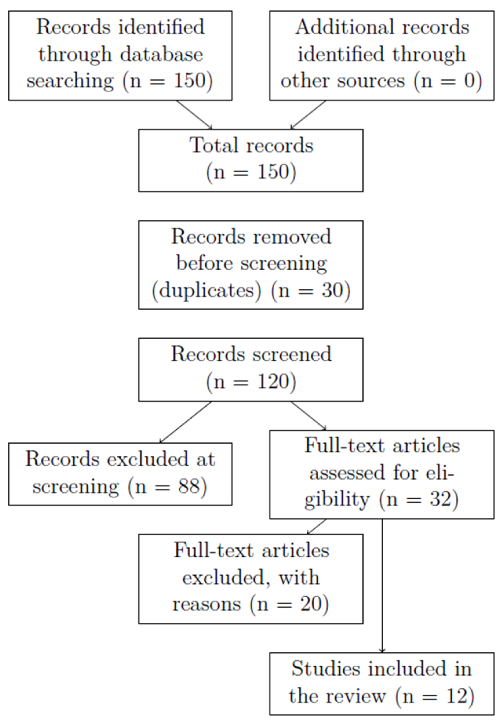 Studies were excluded if they did not investigate onion or its polyphenols, or if they lacked quantifiable bone-related outcomes. After removal of duplicates, titles and abstracts of 120 records identified through database searches were screened for relevance. From among these, 32 articles were deemed relevant and underwent full-text screening. Ultimately, 12 studies meeting all inclusion criteria were included in this review for data extraction and analysis. Figure 1 presents the PRISMA flow diagram of the study selection process.