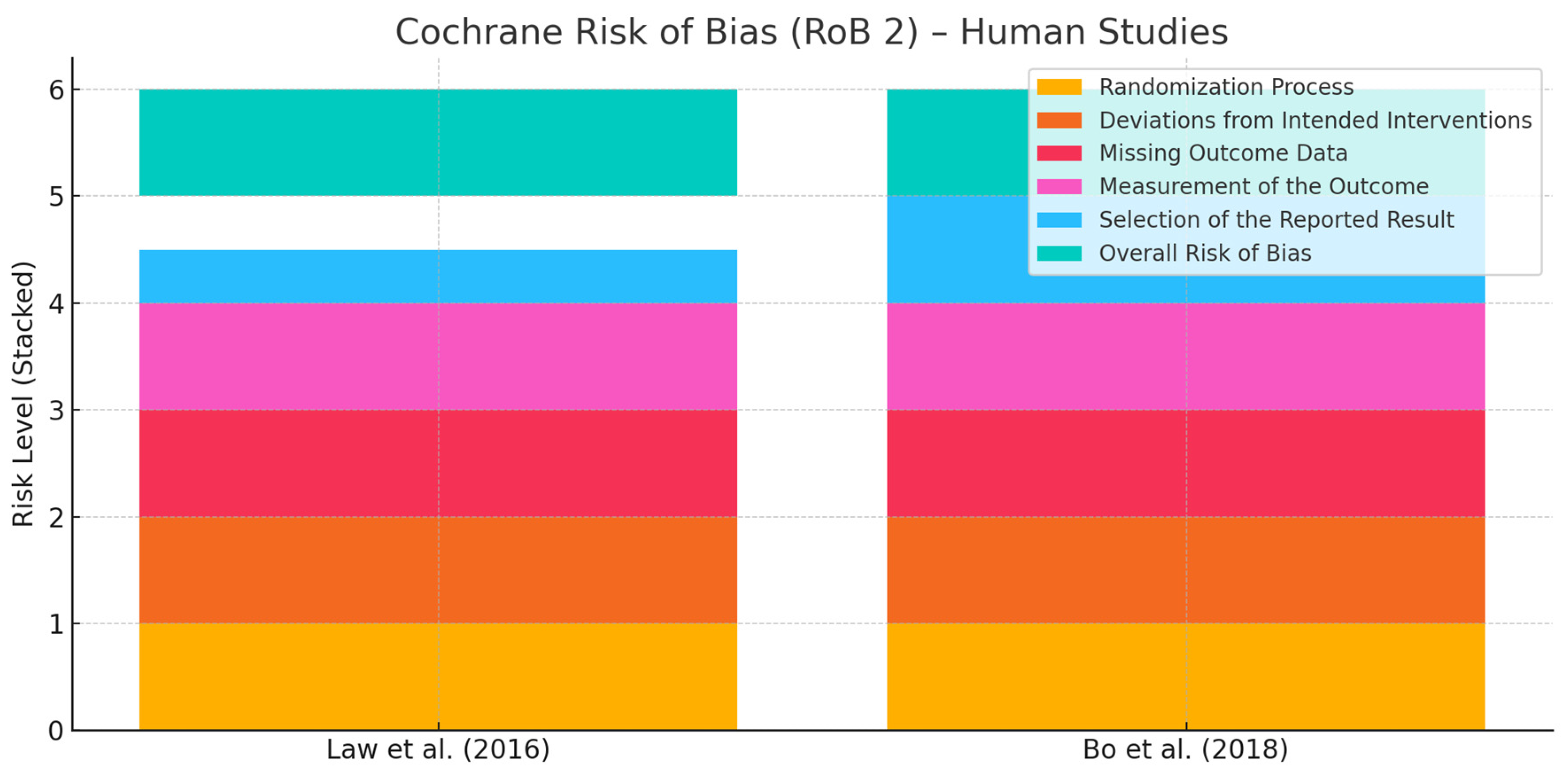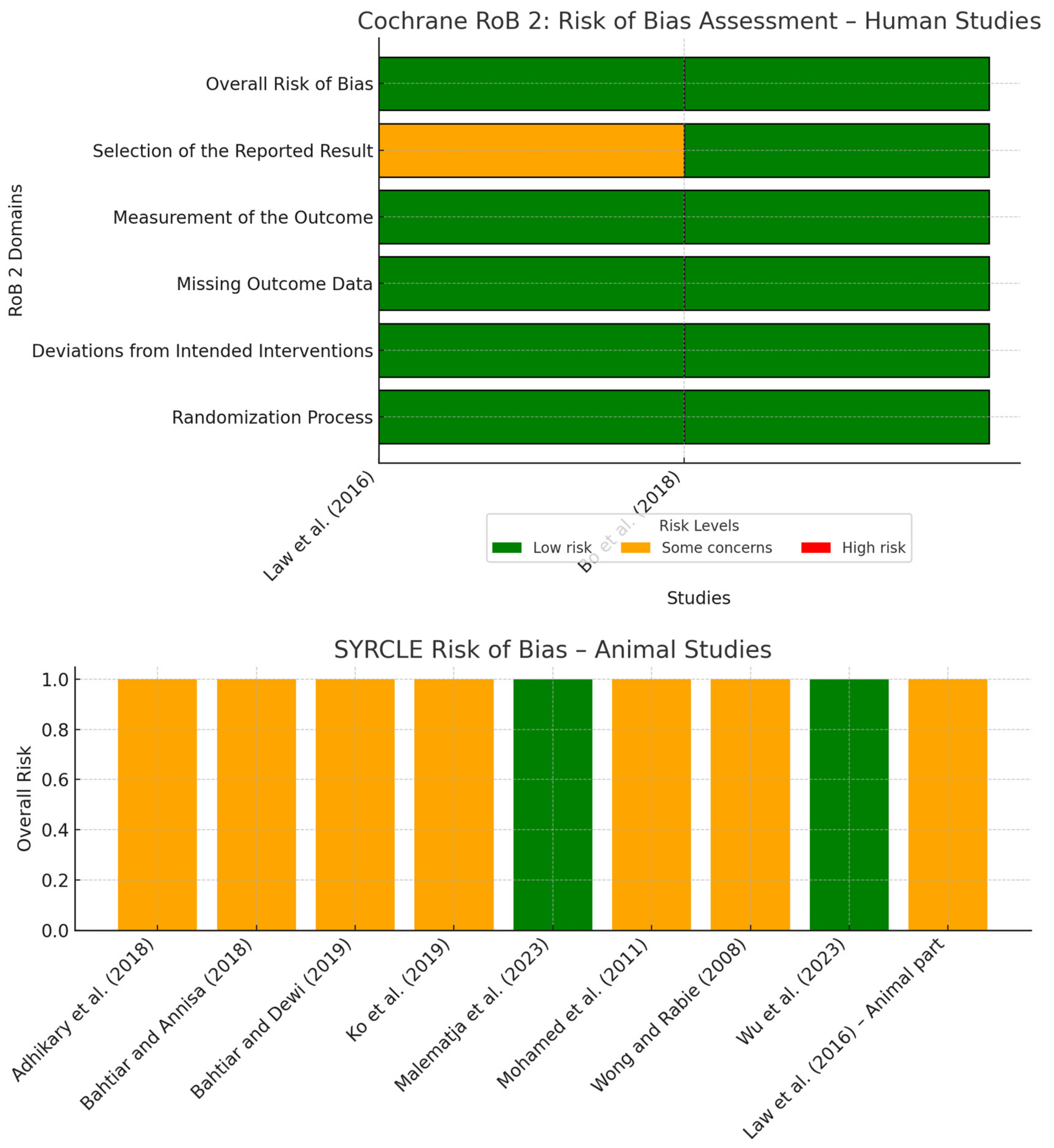 Risk of bias was evaluated independently by two reviewers using tools specific to the study design, in accordance with Cochrane recommendations. Human randomized controlled trials were appraised with the Cochrane Risk of Bias 2 (RoB 2) tool, covering five domains—(1) randomization process, (2) deviations from intended interventions, (3) missing outcome data, (4) outcome measurement, and (5) selection of the reported result—and receiving an answer through discussion or arbitration by a third reviewer. Summary traffic-light plots and weighted bar plots were generated with the robvis web application (version 0.3.0) and are presented in Figure 2 and Figure 3. Overall judgements included “low risk”, “several concerns”, or “high risk”. Non-randomized human studies would have been assessed with RoBINS-I; however, none met the inclusion criteria. Animal experiments were assessed with the SYRCLE RoB tool, which adapts RoB 2 to pre-clinical settings across ten domains (e.g., allocation concealment, random housing, blinding, and selective outcome reporting). Each domain was rated as “low”, “unclear”, or “high” risk. Disagreements were resolved.