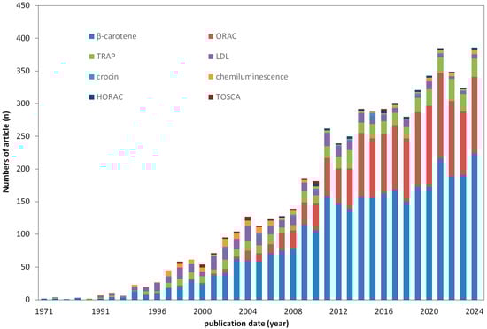 As the examples presented (see Table 1) demonstrate, the β-carotene bleaching method is used under various measurement conditions, which undoubtedly makes it difficult, if not impossible, to compare the results of different research teams. However, the lack of a uniform presentation of results is not the only problem with this method. Its infamous reputation also stems from the low reproducibility of the obtained results. Furthermore, emulsion preparation is time-consuming and labor-intensive, and susceptible to interference from various factors (including the solvent used, the influence of metal ions, pH, and temperature) [,]. As a result, as Figure 1 shows, the applicability of the β-carotene method, measured by the number of publications indexed in the Scopus database, has not increased over the last five years and remains at a comparable level of approximately 330 publications per year.