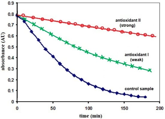 β-carotene is a weak antioxidant; therefore, when other antioxidants are present in solution, they react first protecting the β-carotene structure by intercepting the attack of reactive oxygen species before they can attack and destroy the β-carotene. Only when these are depleted, and peroxyl radicals are still present in the measurement system, does β-carotene take over the antioxidant function. In this case, depending on the antioxidant’s potency, its consumption over time is lower (higher) than in the control sample, corresponding to the stronger (weaker) antioxidant–compare the positions of the curves in Figure 3 [].